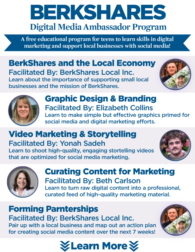 The BerkShares Digital Media Ambassador Program is a 12-week hands-on educational program for teens to learn skills in digital marketing while supporting small local businesses with their social media outreach.